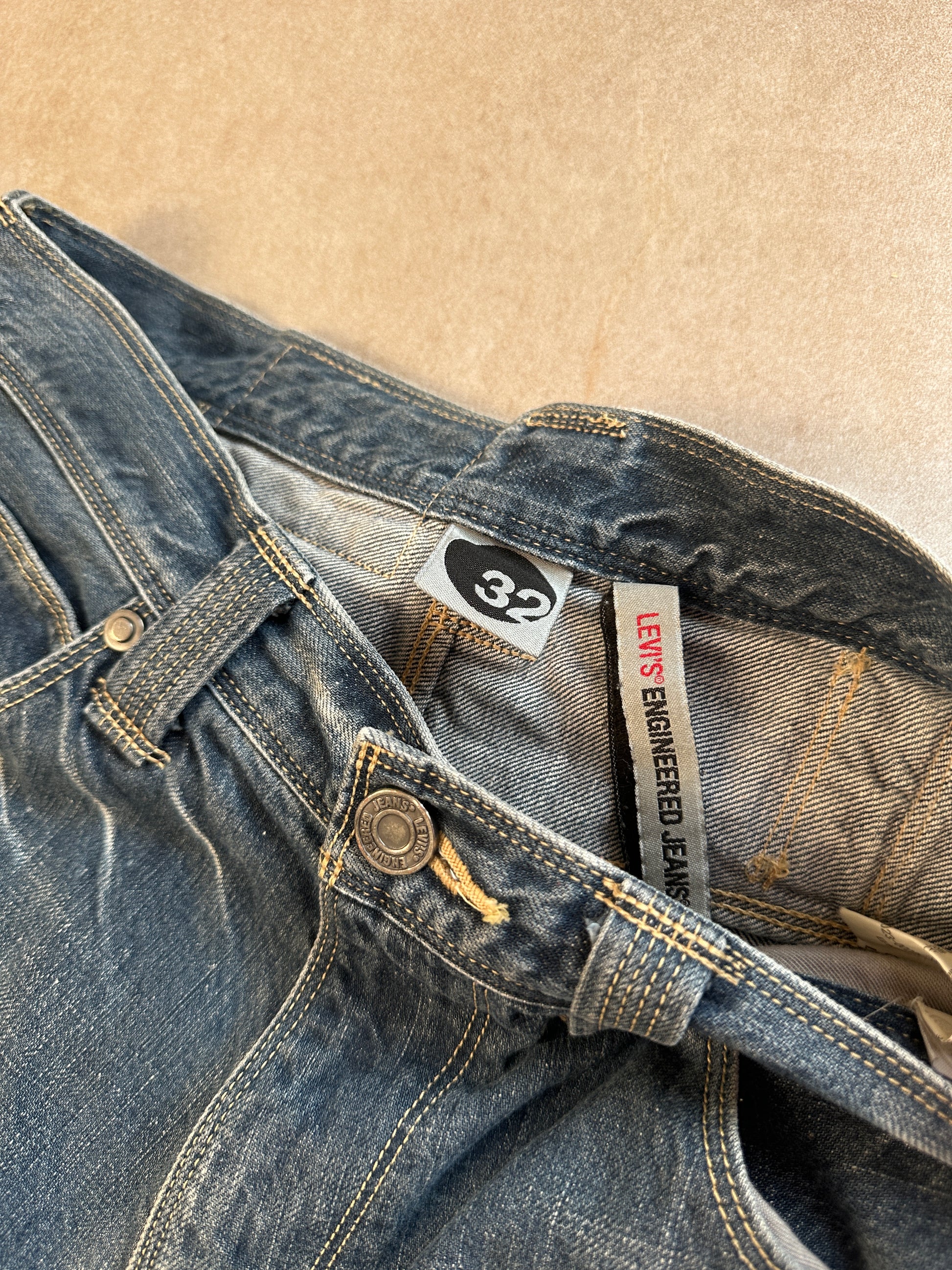 levi’s jeans featuring signature 3d twisted leg construction and cinch back detail. condition is very good overall, with some light fraying at the hem—consistent with vintage wear.