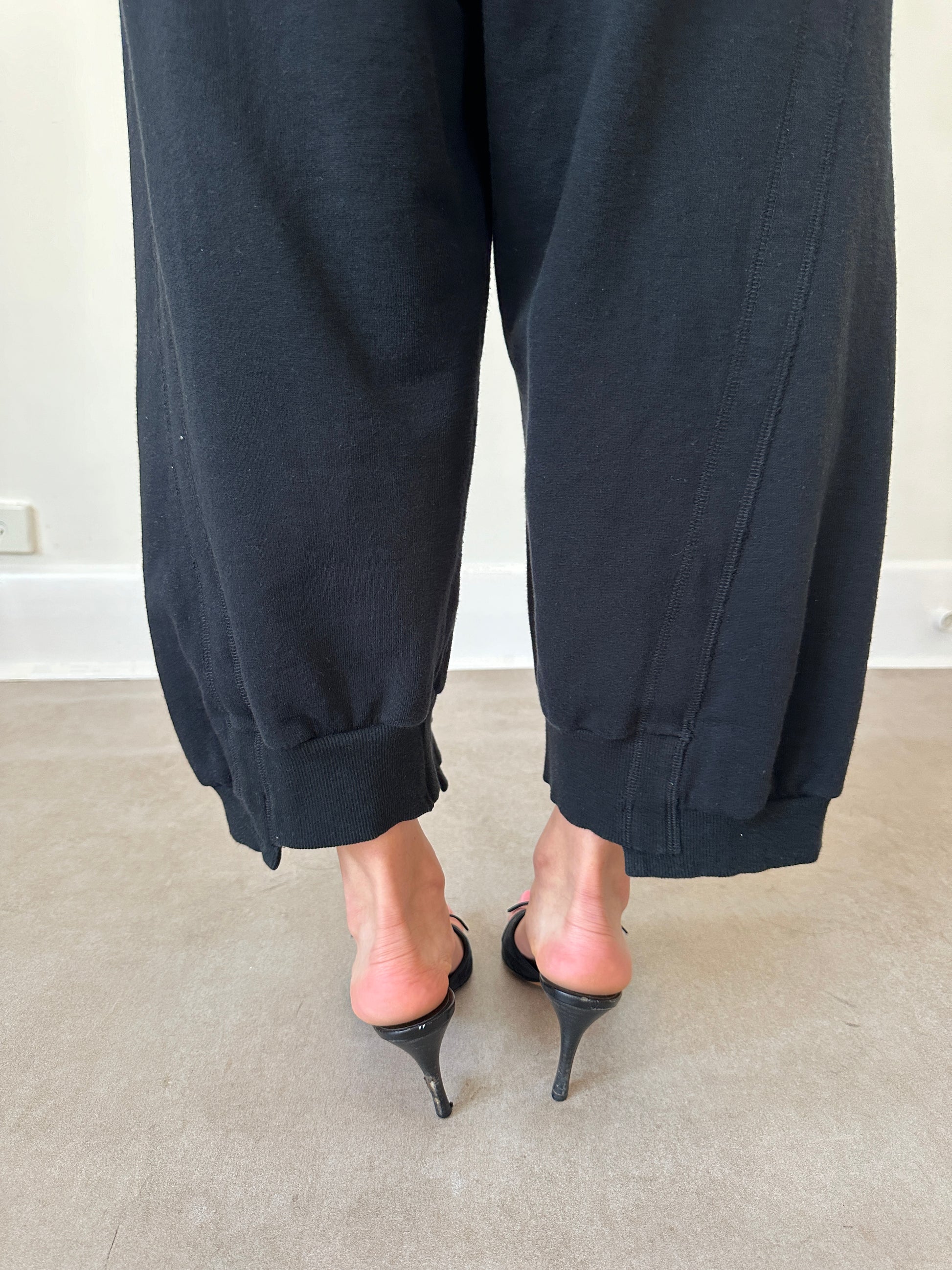 y’s by yohji yamamoto black saruel sweatpants featuring a wide, relaxed fit with a dropped crotch and ribbed hem. made from soft sweat material with an elastic drawstring waist. includes back pockets. condition is excellent with minimal signs of wear