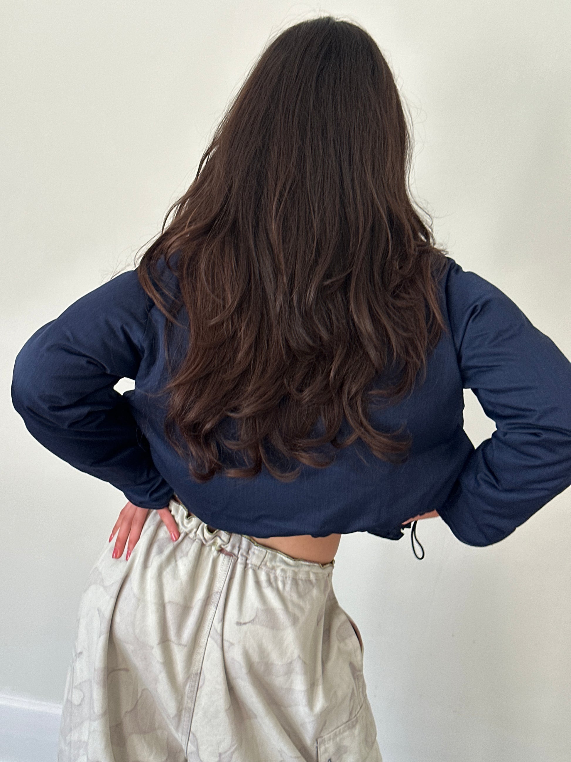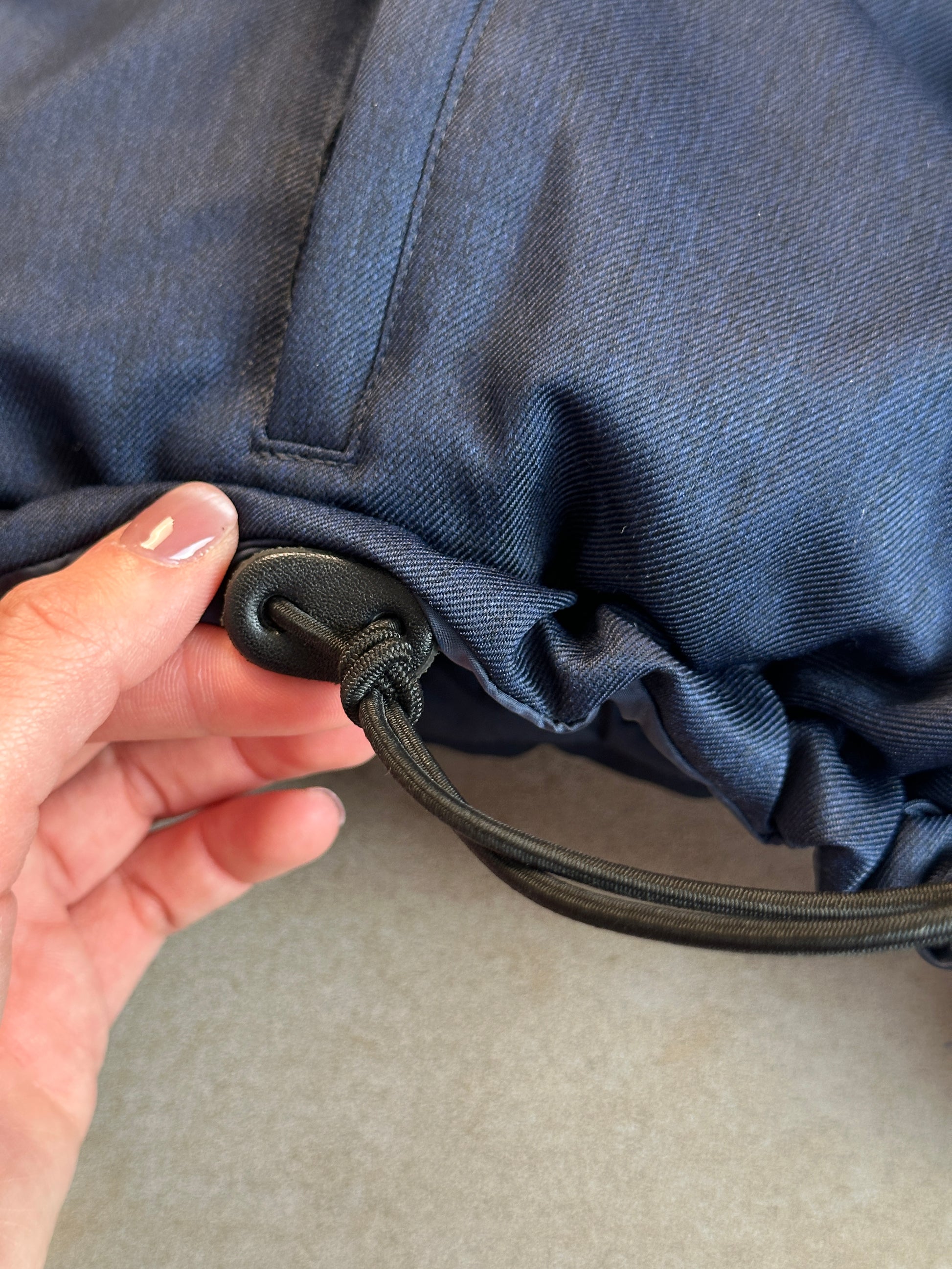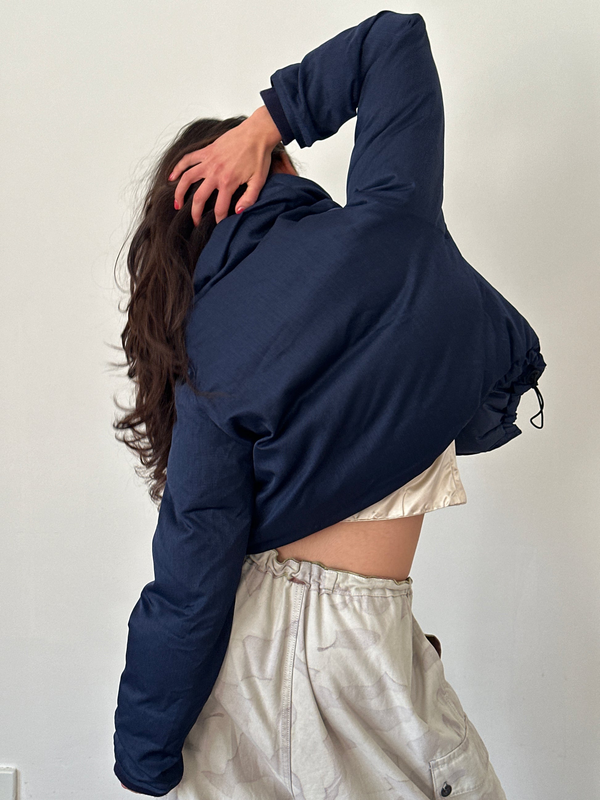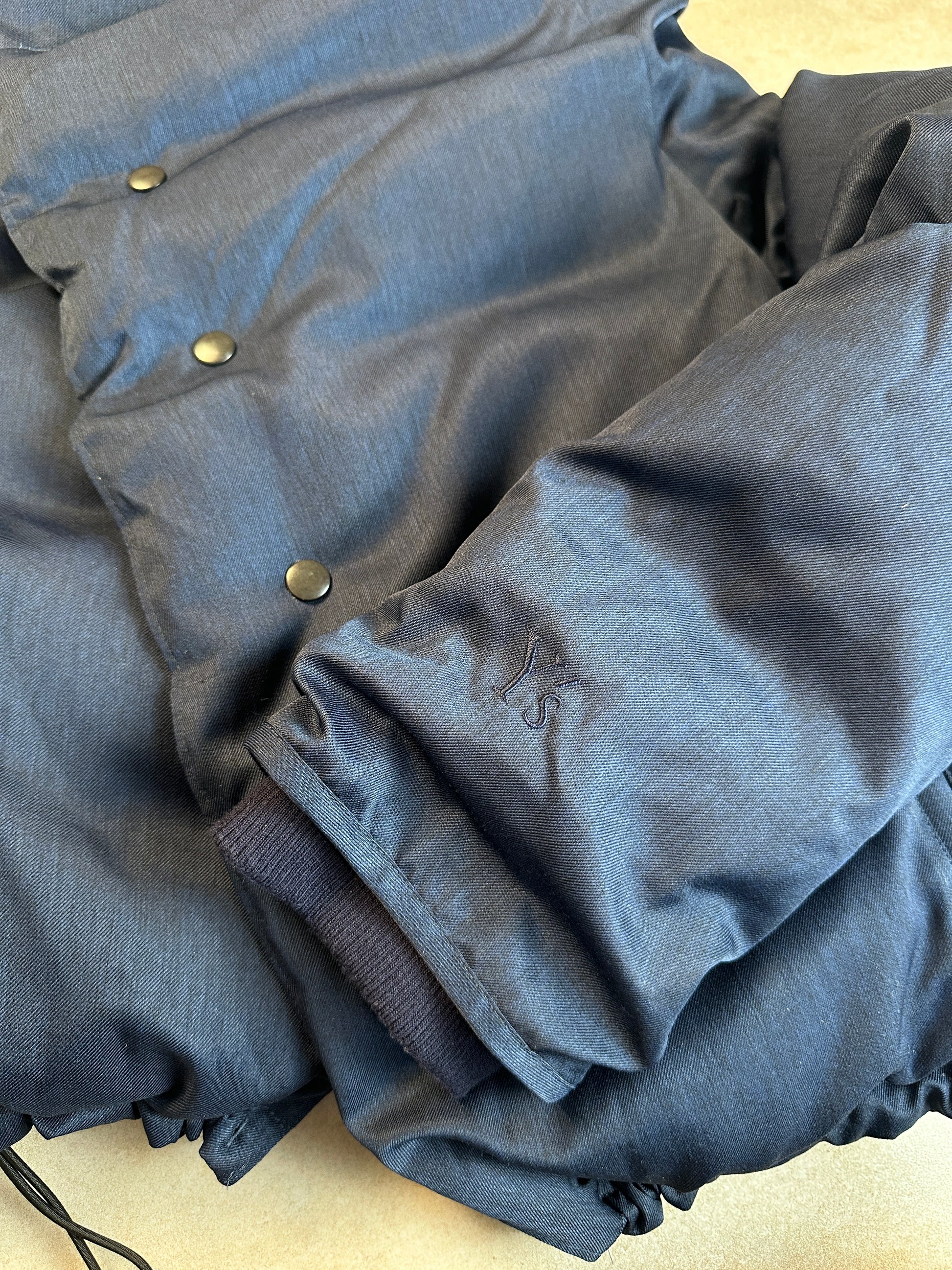 y’s by yohji yamamoto short down jacket in deep navy, featuring a sculptural high collar, asymmetrical snap-button front, and a cropped silhouette. includes side pockets and a drawstring hem for adjustable fit. worn only a few times, in excellent condition with minimal signs of wear
