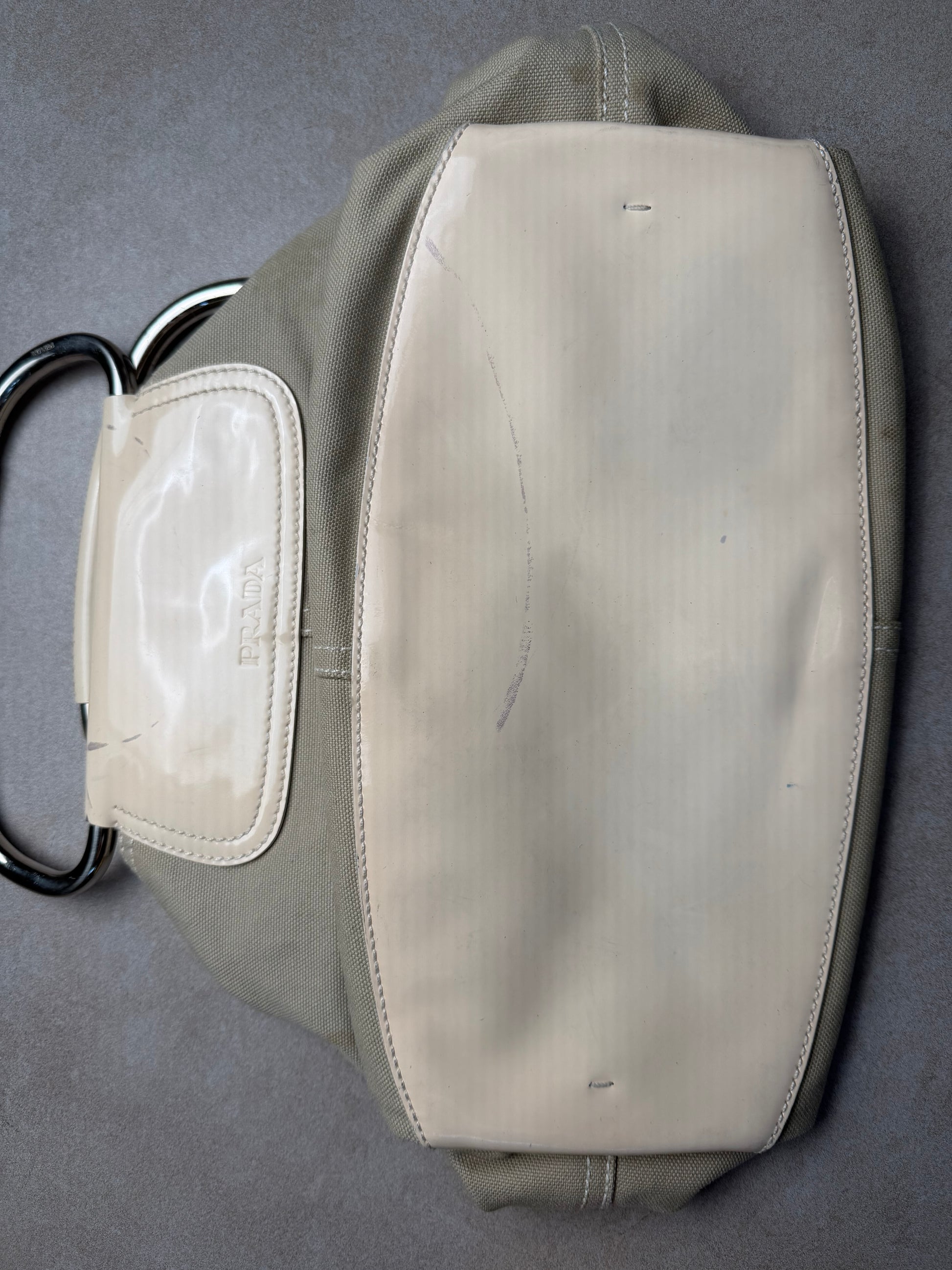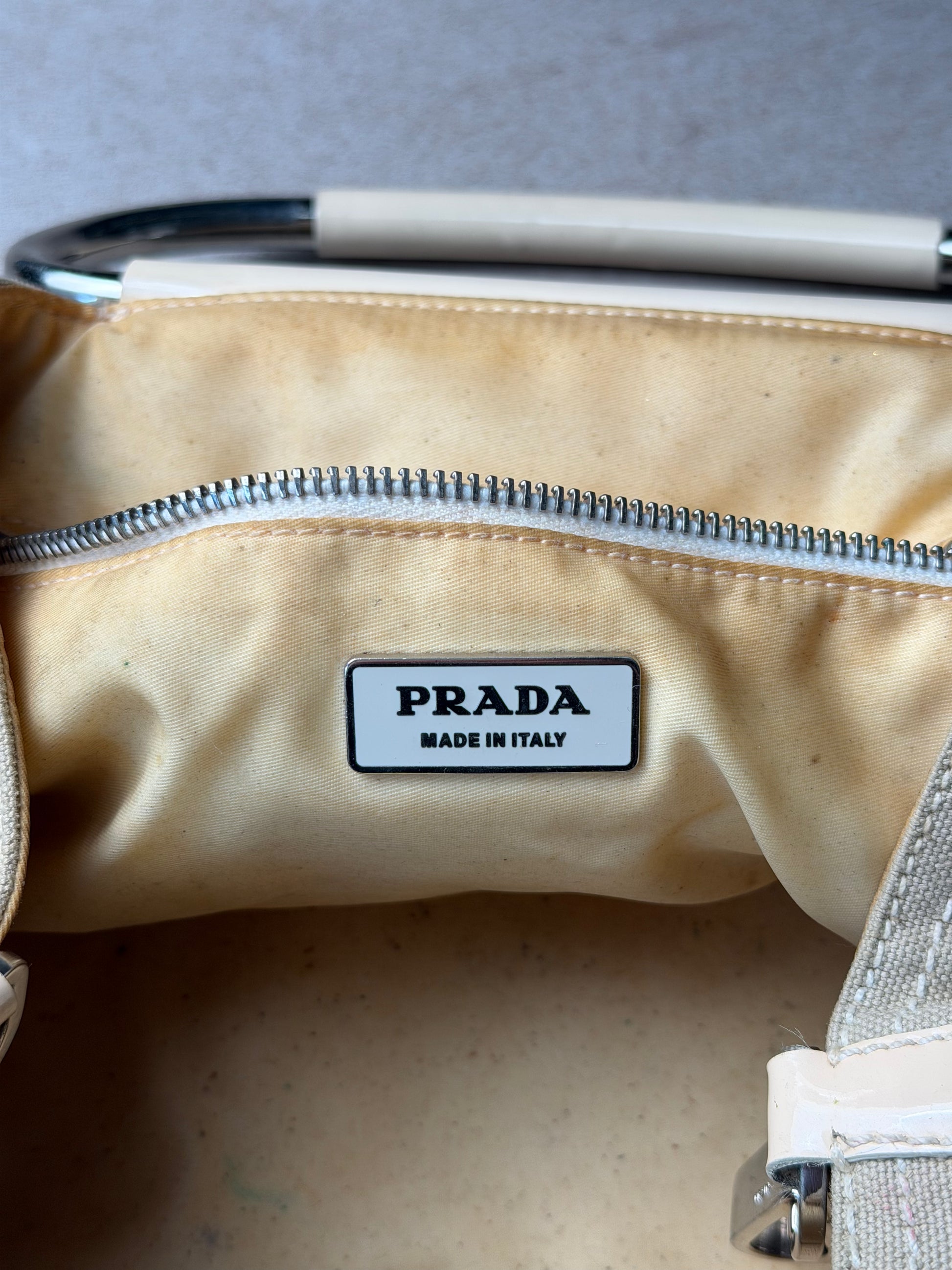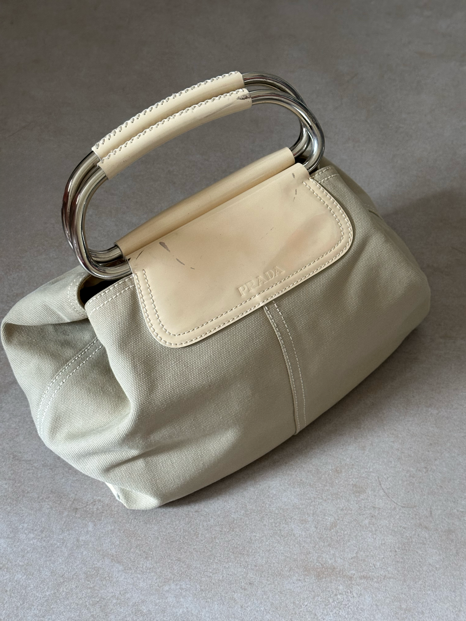 prada spring summer 2003 beige canvas handbag featuring the iconic metal handle. seen in an episode of sex and the city, this bag is hard to come by. structured base and glossy patent flap closure embossed with prada logo. tonal stitching and soft canvas body, in worn vintage condition with visible marks and scuffs on the patent flap (see photos for reference)