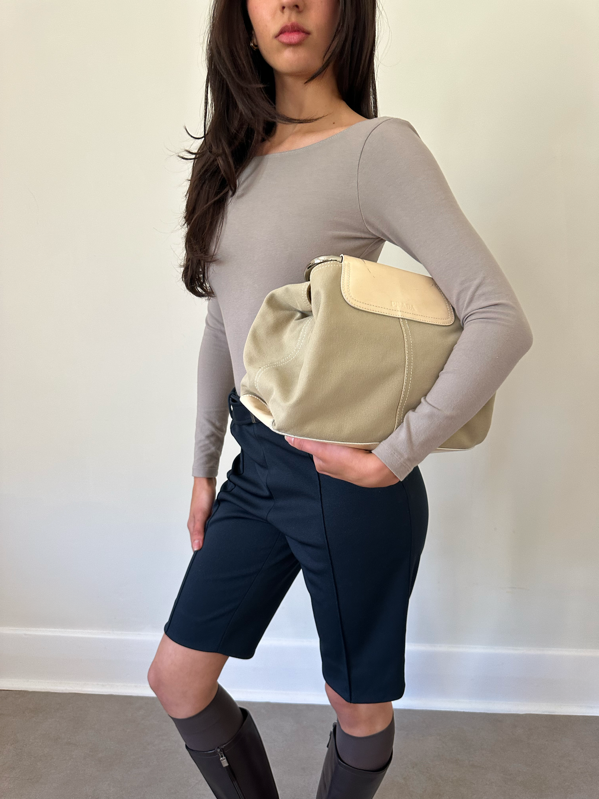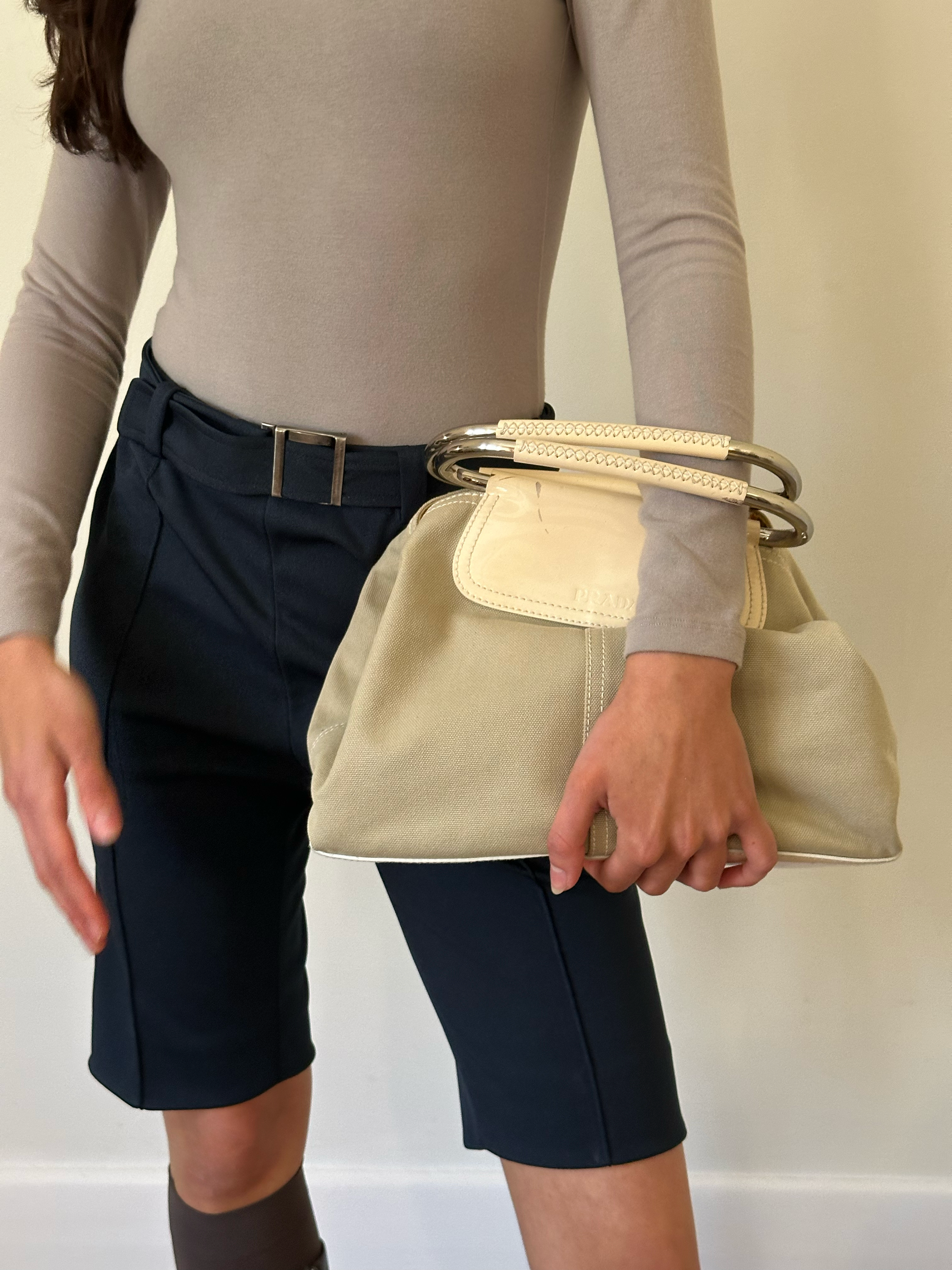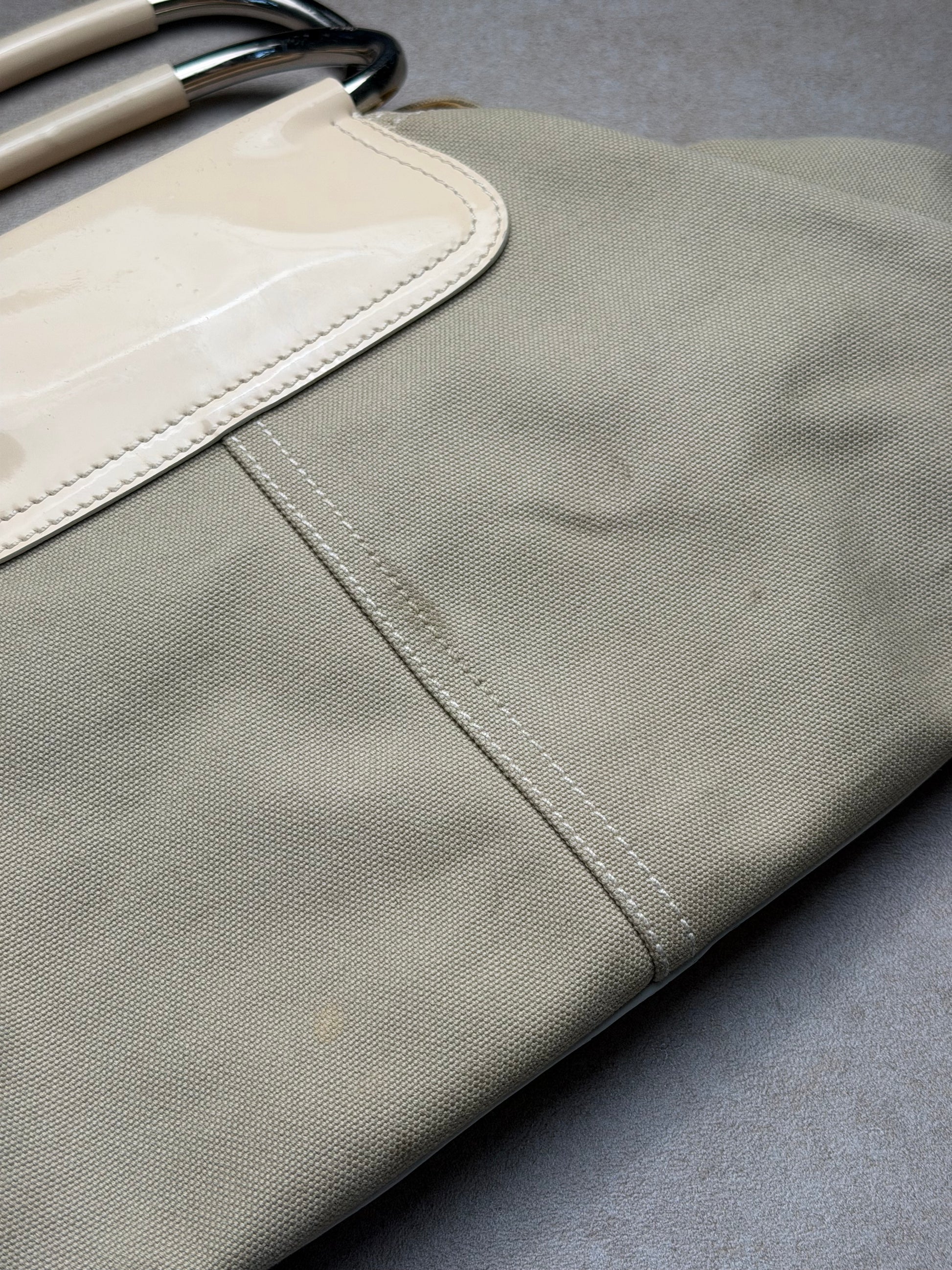 prada spring summer 2003 beige canvas handbag featuring the iconic metal handle. seen in an episode of sex and the city, this bag is hard to come by. structured base and glossy patent flap closure embossed with prada logo. tonal stitching and soft canvas body, in worn vintage condition with visible marks and scuffs on the patent flap (see photos for reference)